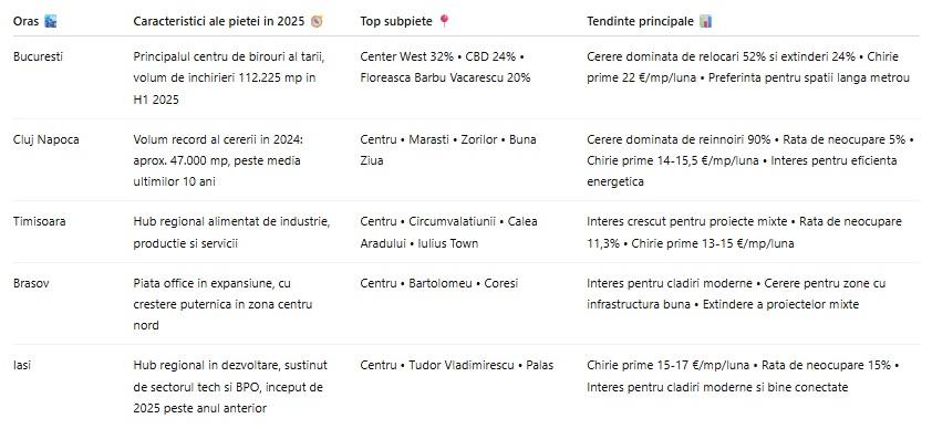 Tabel sinteza – top zone din Romania pentru inchirierea spatiilor de birouri in 2025
