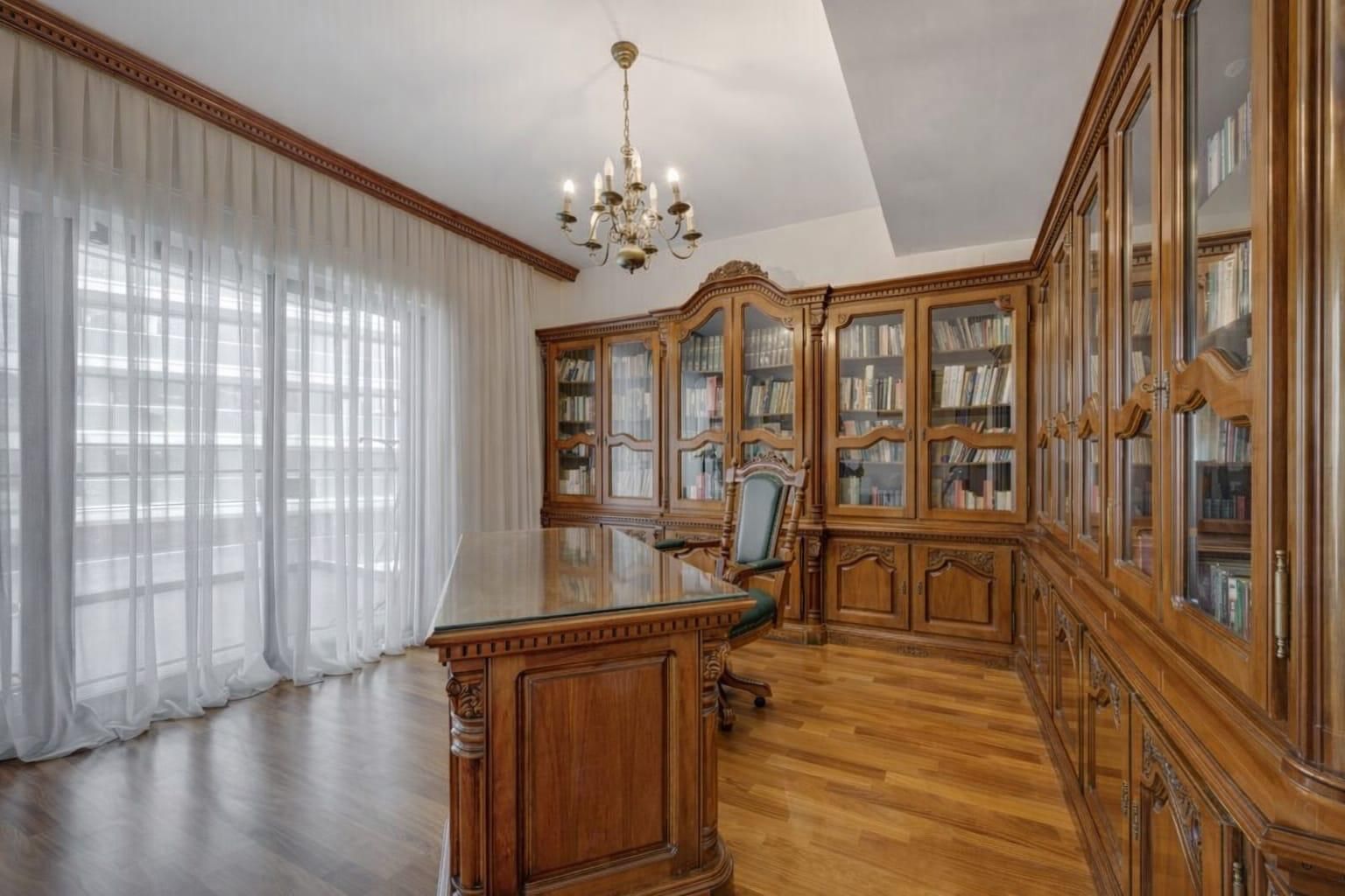 The interior impresses with its balance, refinement and quality of execution. The fixed furniture is made entirely to order in solid wood, the finishes are of a superior level, and the apartment has been kept impeccable. The solid wood, marble and natural stone floors used in the bathrooms and circulation areas, the aluminum joinery and the air conditioning system discreetly integrated into the ceilings contribute to an elegant and warm environment. The apartment is sold with all fixed elements integrated, the movable bodies and decorative objects to be withdrawn.