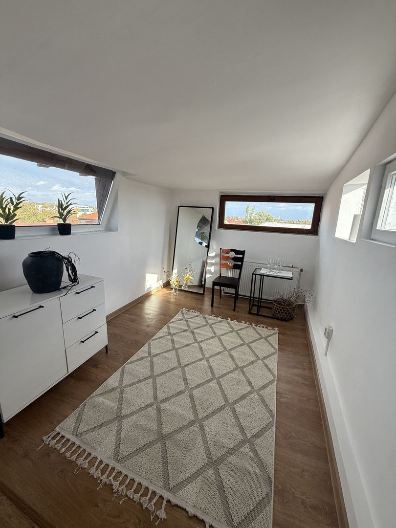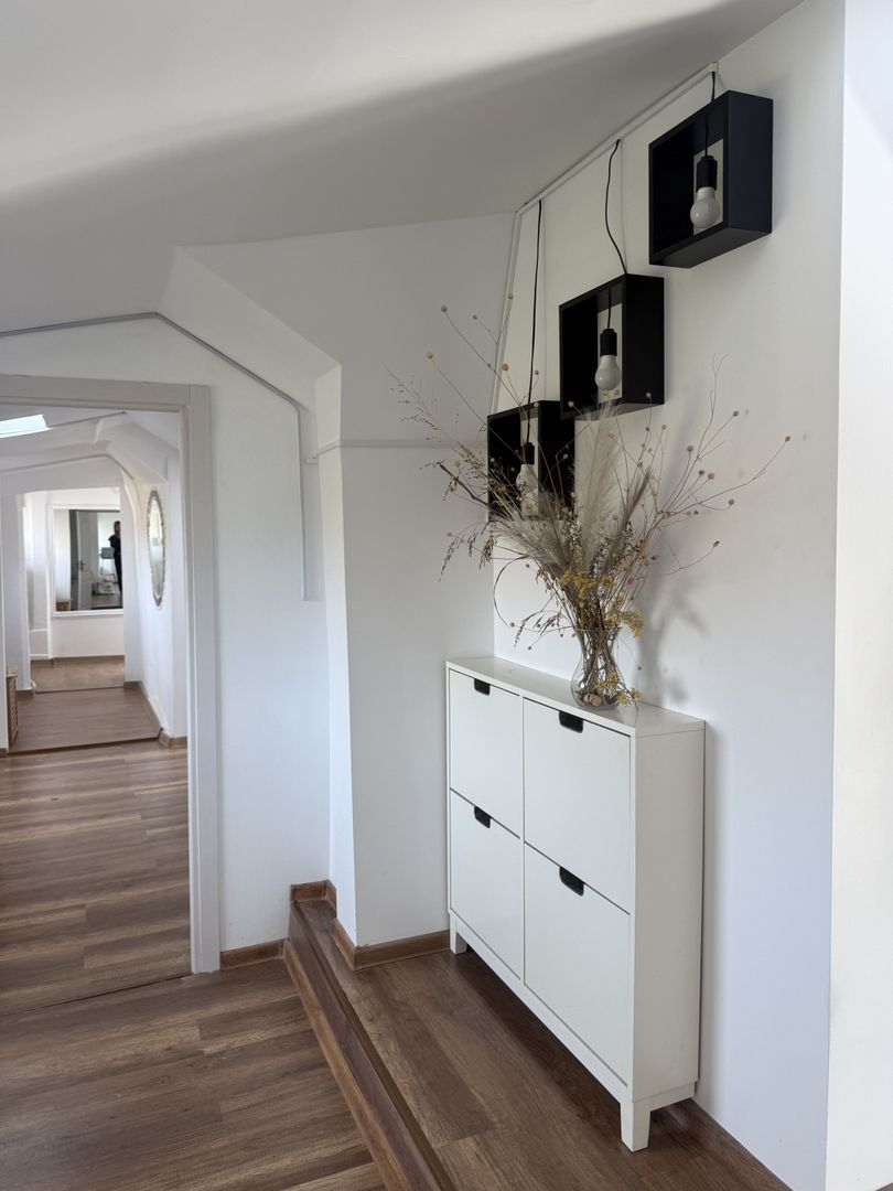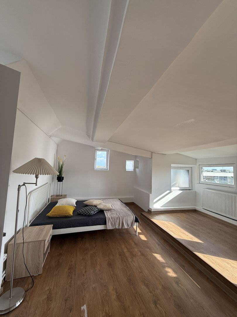 With a generous area of about 150 sqm, the apartment is composed of four bright rooms and three spacious bathrooms. It is located on the top floor and has a warm, attic-like air, offering a welcoming atmosphere and an open view.