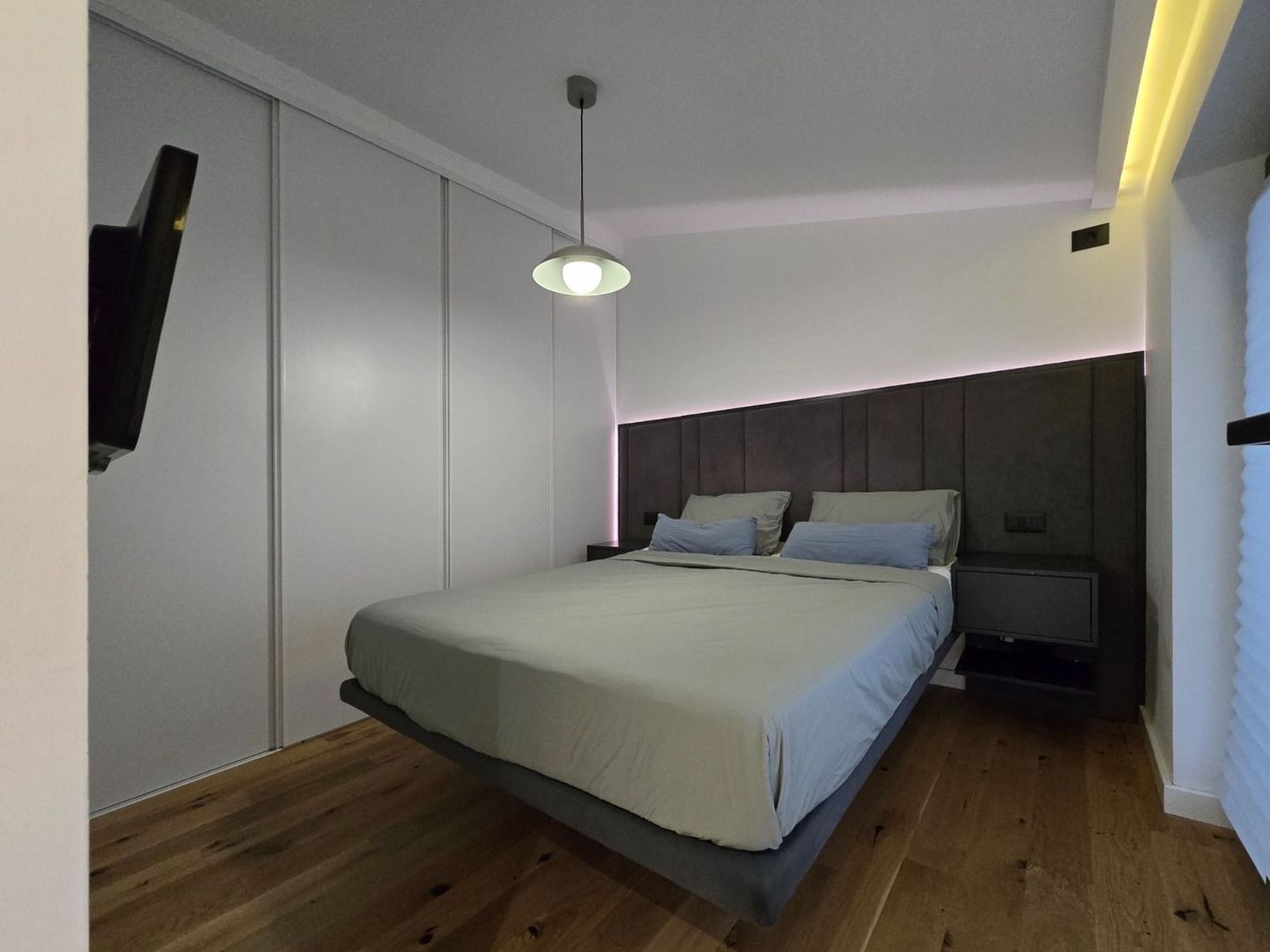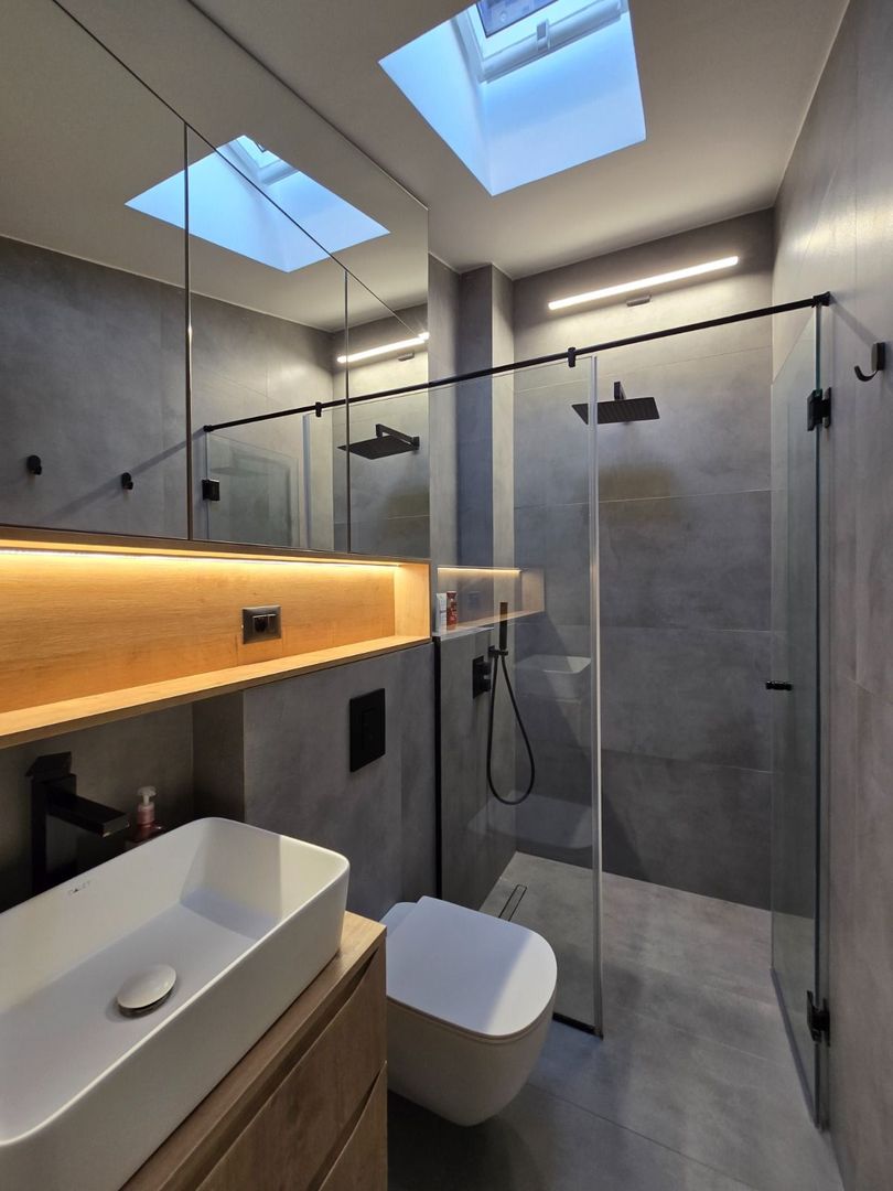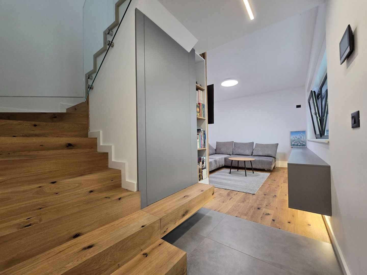 The building currently operates as a premium duplex, with two completely independent housing units, separated by a 30 cm Porotherm STH masonry wall + 10 cm mineral wool + plasterboard walls. Thanks to the frame structure, the partitions can be easily modified, and the building can be transformed into a single spacious home.