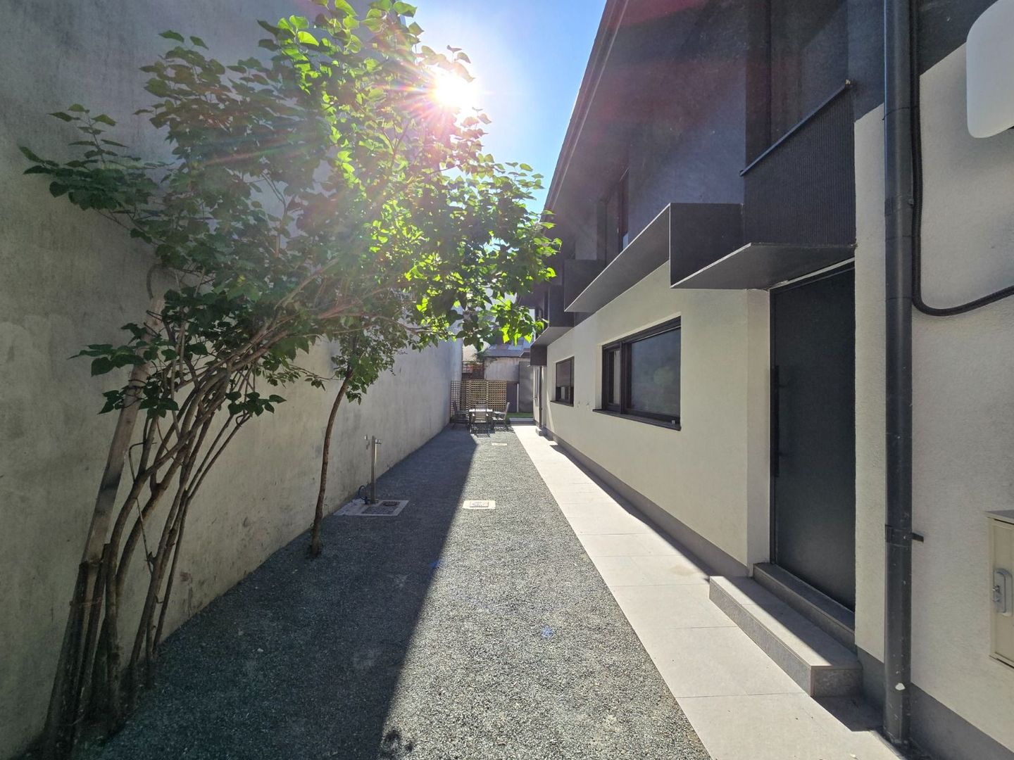 Secondary courtyard with green area, lawn and relaxation area (sofa, table, chairs, barbecue)