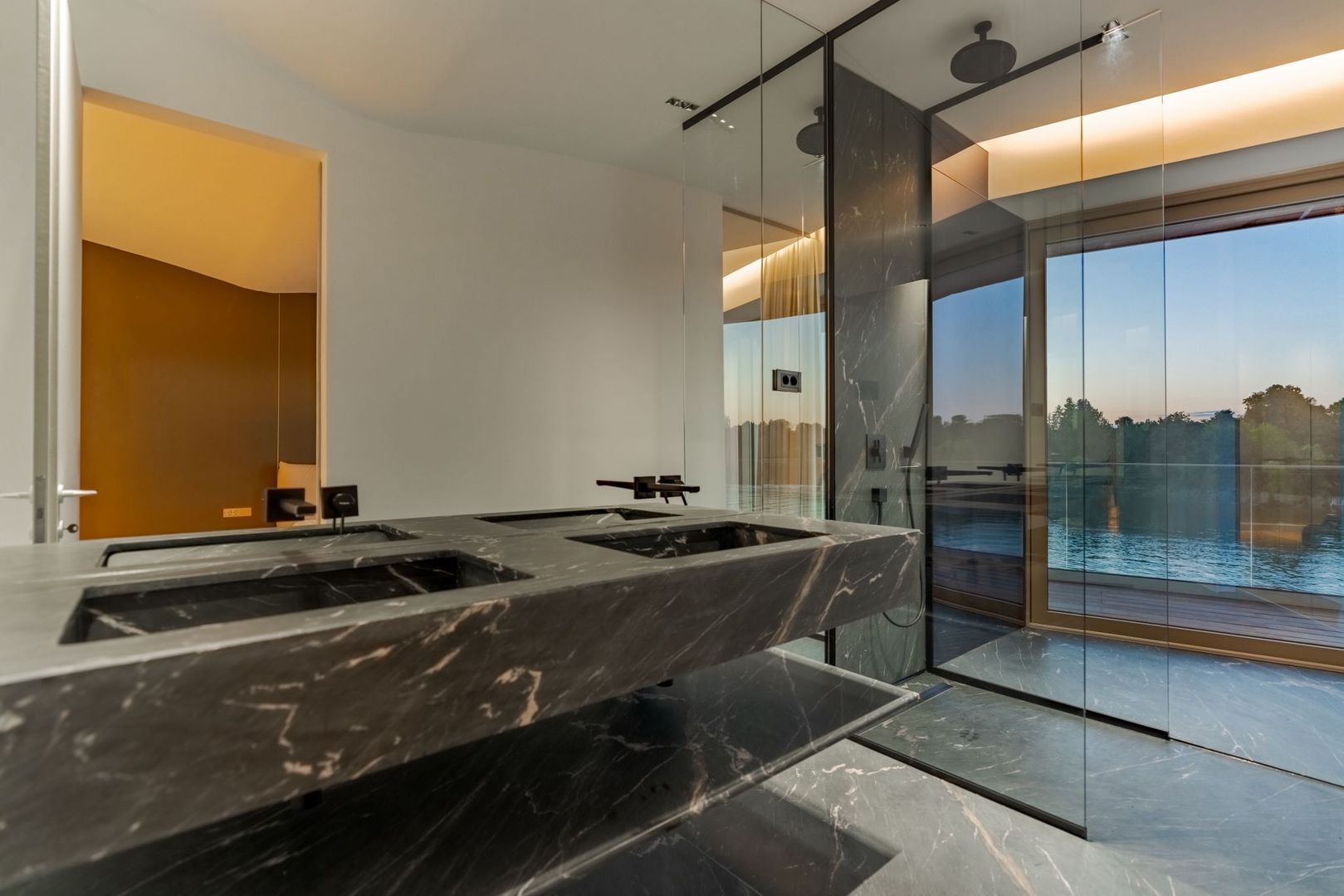 On a generous plot of land, with 40 m of opening to the shore, the property gives you the feeling of living on your own island. The garden naturally merges with the sheen of the water, and the 200 sqm infinity pool seems to unite with the horizon – a place where summer days take on another meaning, and evenings become unforgettable stories.