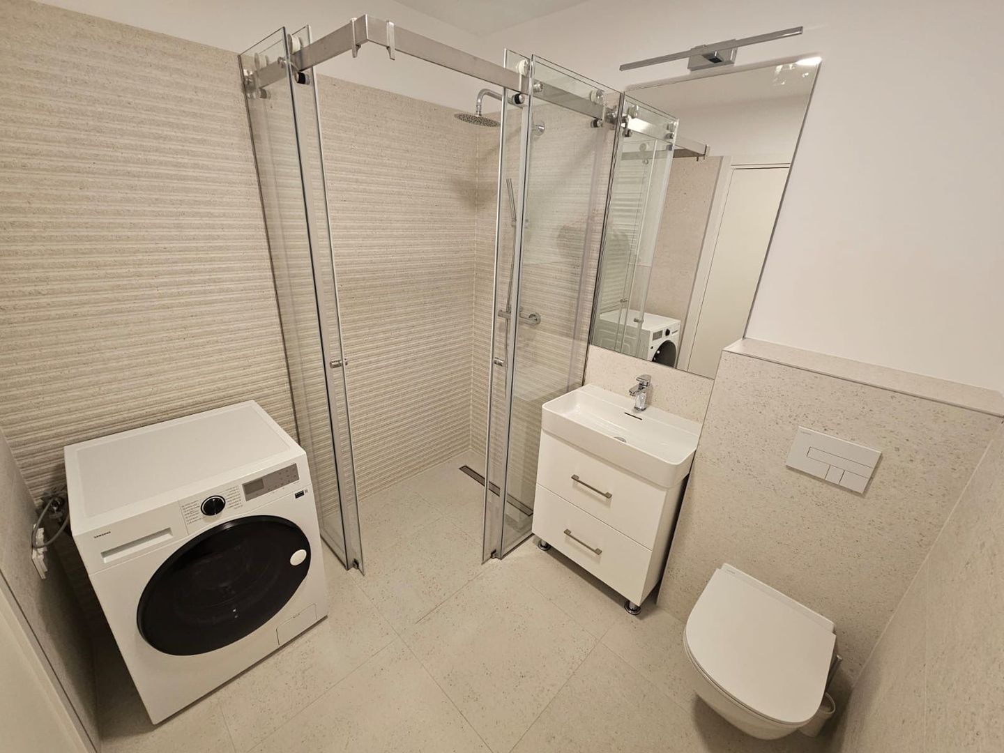 Apartamentul este amenajat cu atenție la detalii și beneficiază de branduri recunoscute pentru calitate: pat Rovere, canapea Cioata, electrocasnice Bosch și Samsung, precum și blat de bucătărie din quartz Aerolith, completat de chiuvetă și baterie Blanco. Baia este elegant finisată cu obiecte sanitare Laufen și baterii Steinberg, iar placările ceramice sunt din colecții premium CERIM / PORCELANOSA – SPIGA BOTTEGA, Italia.