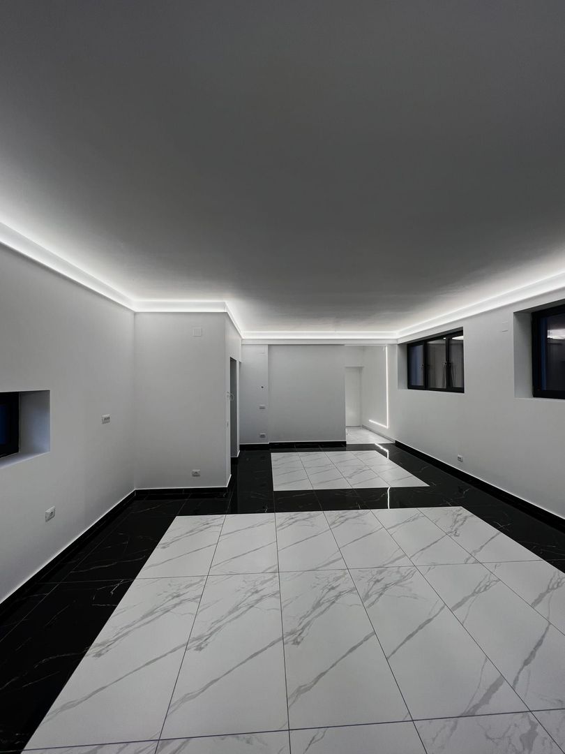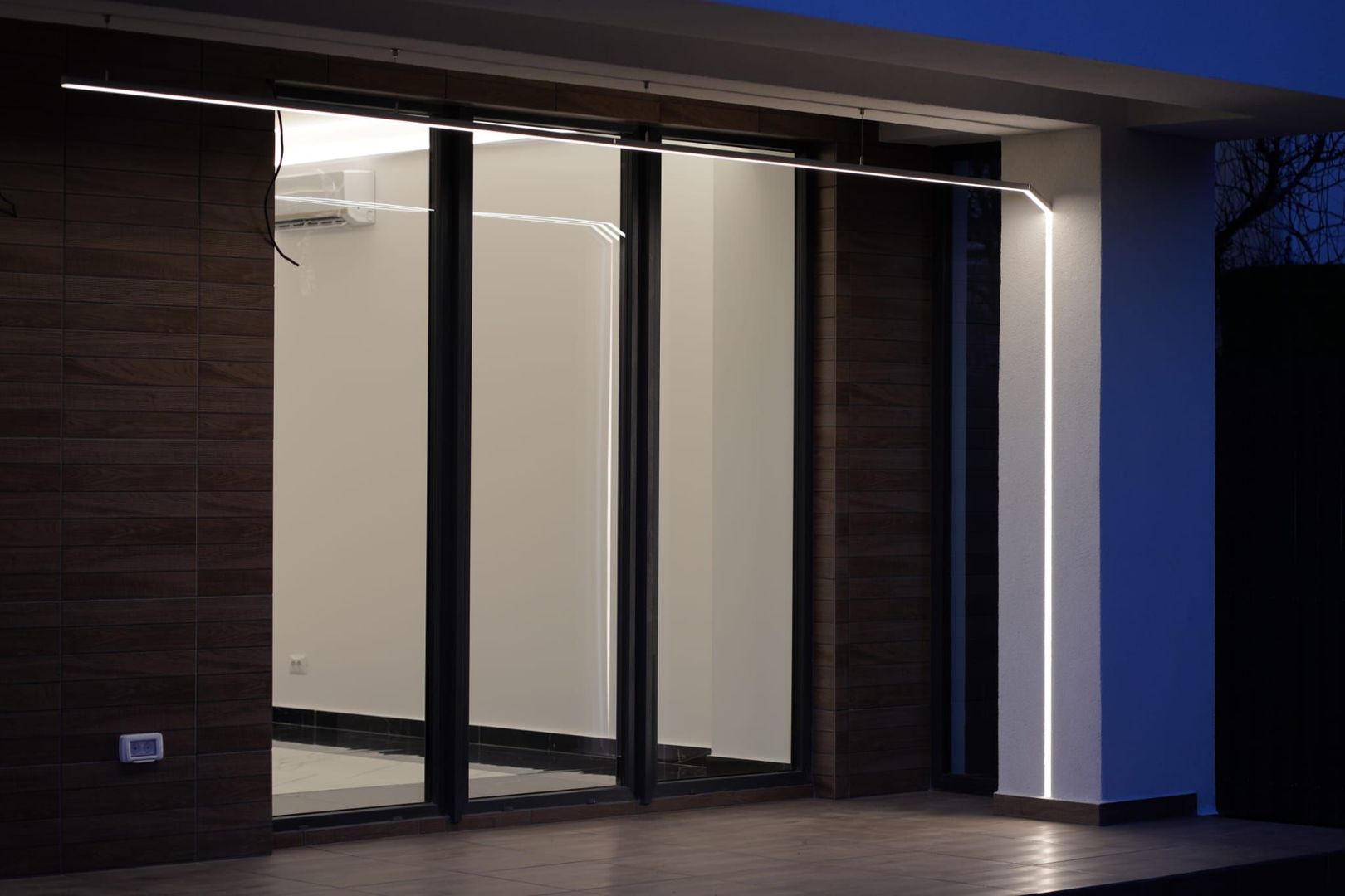 Iluminat arhitectural exterior cu bandă LED – accentuează liniile moderne ale fațadei și oferă un plus de eleganță pe timp de seară;