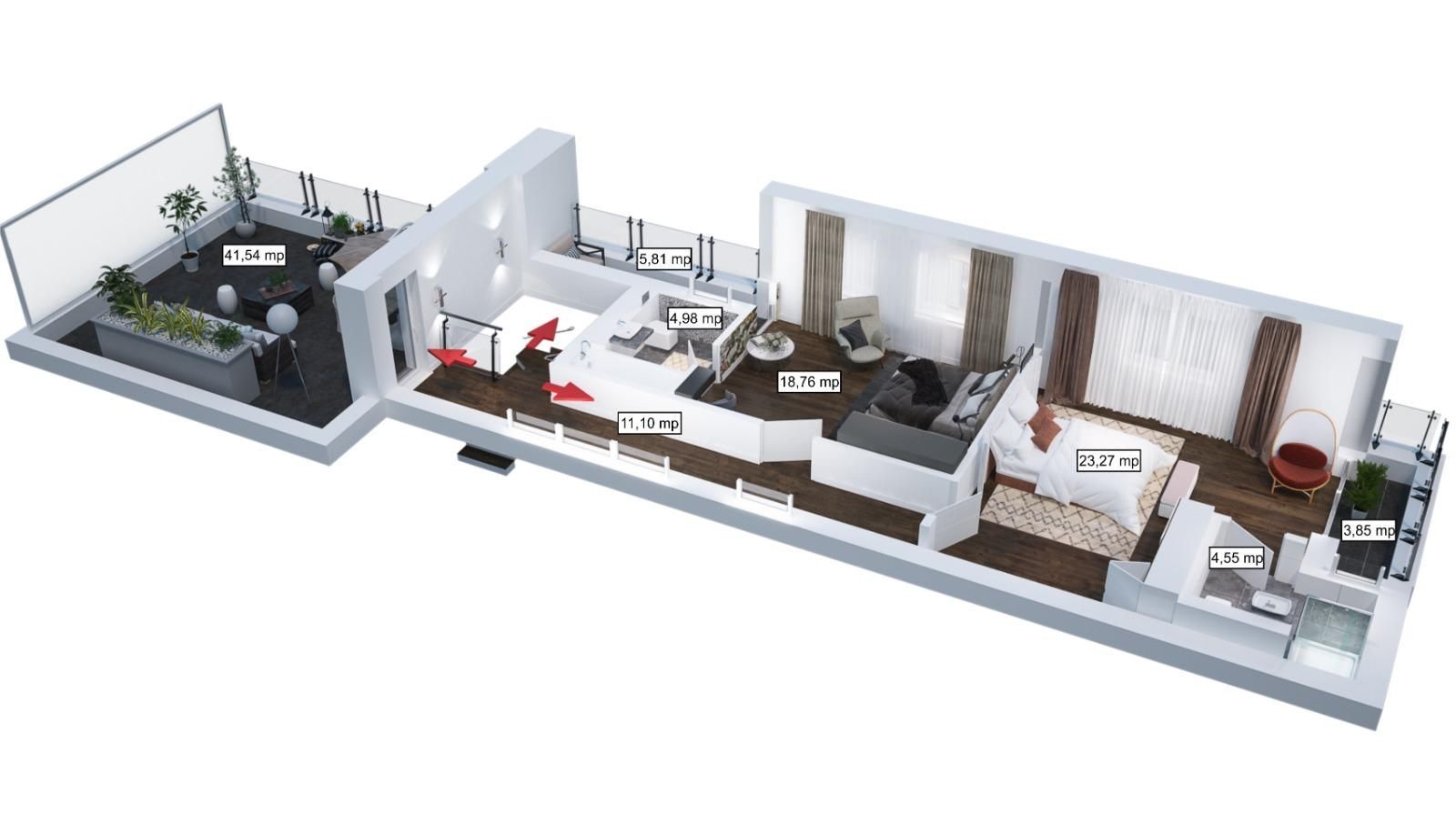Compartimentare eficientă, cu spații generoase și funcționale.