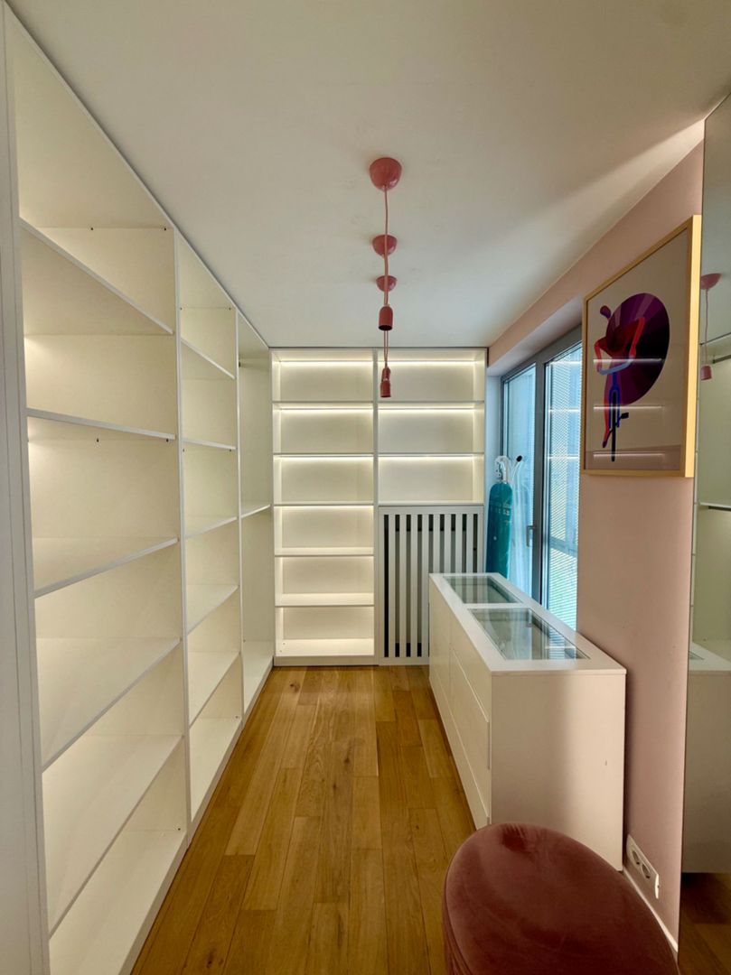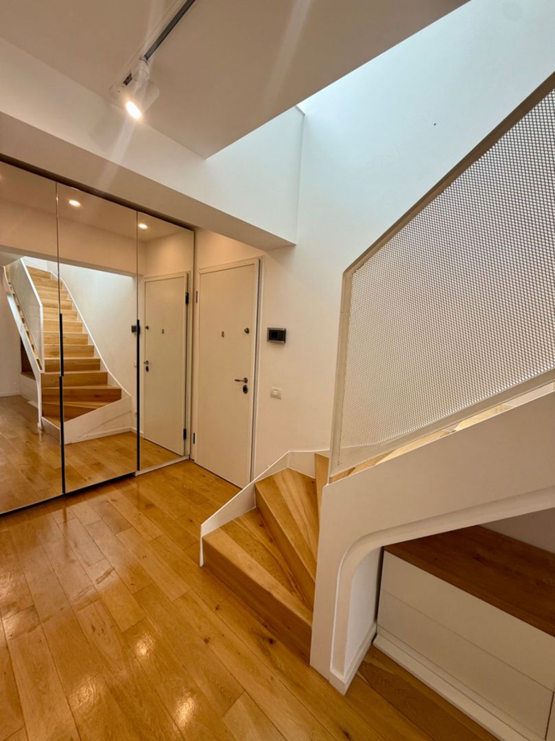 Apartamentul de tip duplex are 3 camere, inteligent compartimentate, însă unul dintre dormitoare a fost transformat într-un dressing generos, perfect pentru un lifestyle modern și organizat. Spațiile sunt luminoase, cu finisaje atent alese și un aer minimalist, dar cald.