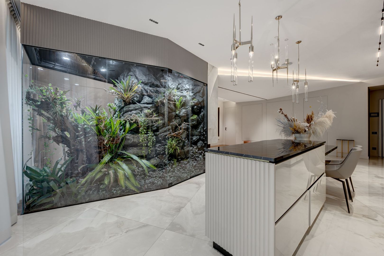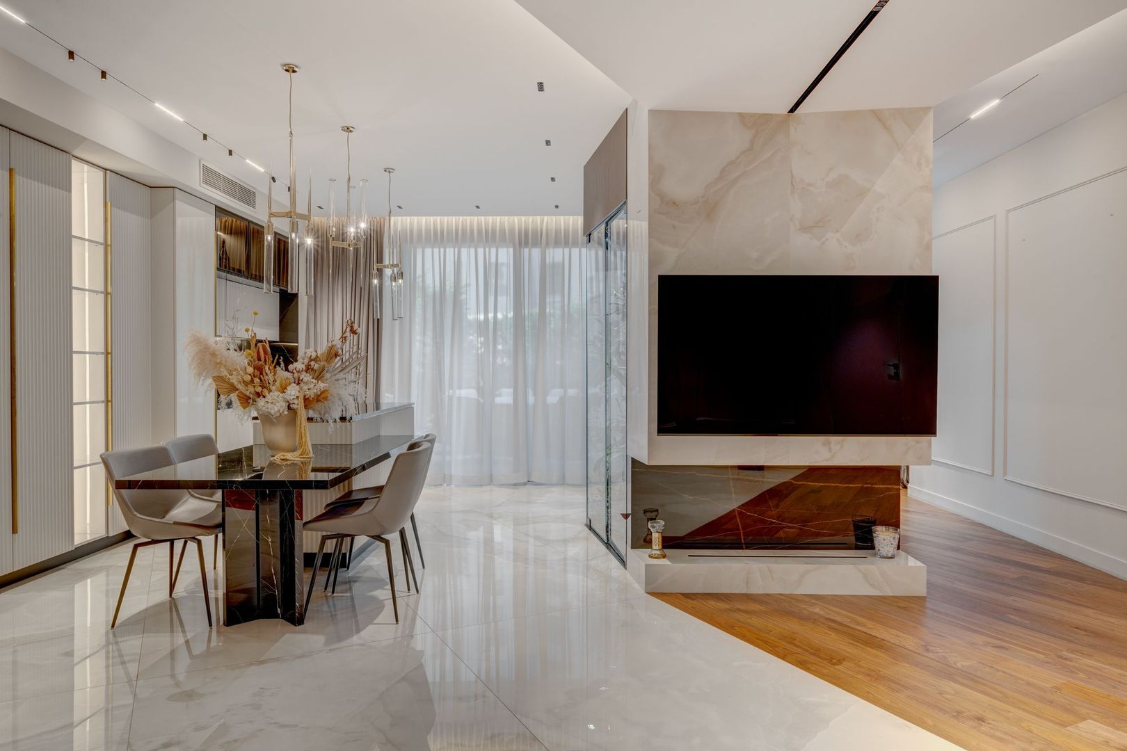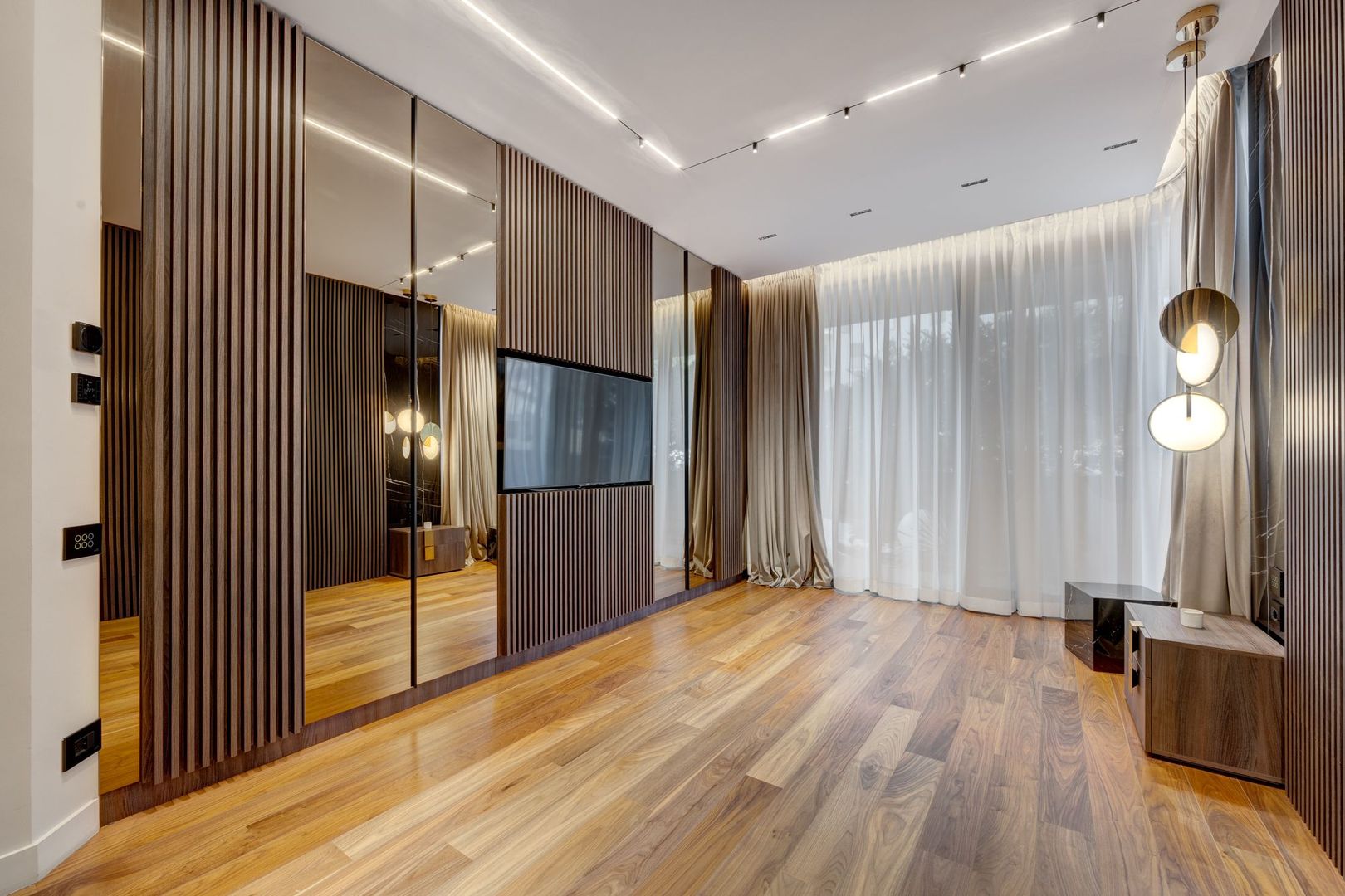 Proprietatea a fost complet personalizată, toate finisajele standard fiind înlocuite cu materiale premium, atent alese, de cea mai bună calitate. Apartamentul beneficiază de sistem smart home, care permite controlul iluminatului, climatizării și altor funcții esențiale, oferind un plus de eficiență, siguranță și confort zilnic.