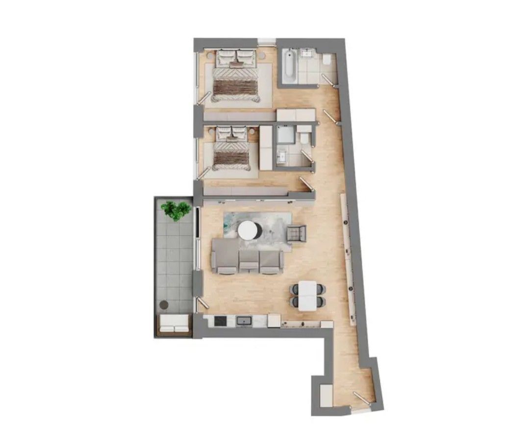 Apartament 3 camere situat la etajul 2 cu orientare sud-est, decomandat, cu living si bucatarie deschisa, doua dormitoare si doua bai, oferind o compartimentare echilibrata si lumina naturala pe tot parcursul zilei. Finisaje premium: tamplarie din aluminiu Cortizo, parchet triplustratificat tip dusumea, ceramica Florim/Marazzi, obiecte sanitare Gala sau similar, usi Pinum/Dierre, incalzire in pardoseala Tece, climatizare Mitsubishi Heavy Industries sau Samsung, module termice Caleffi.