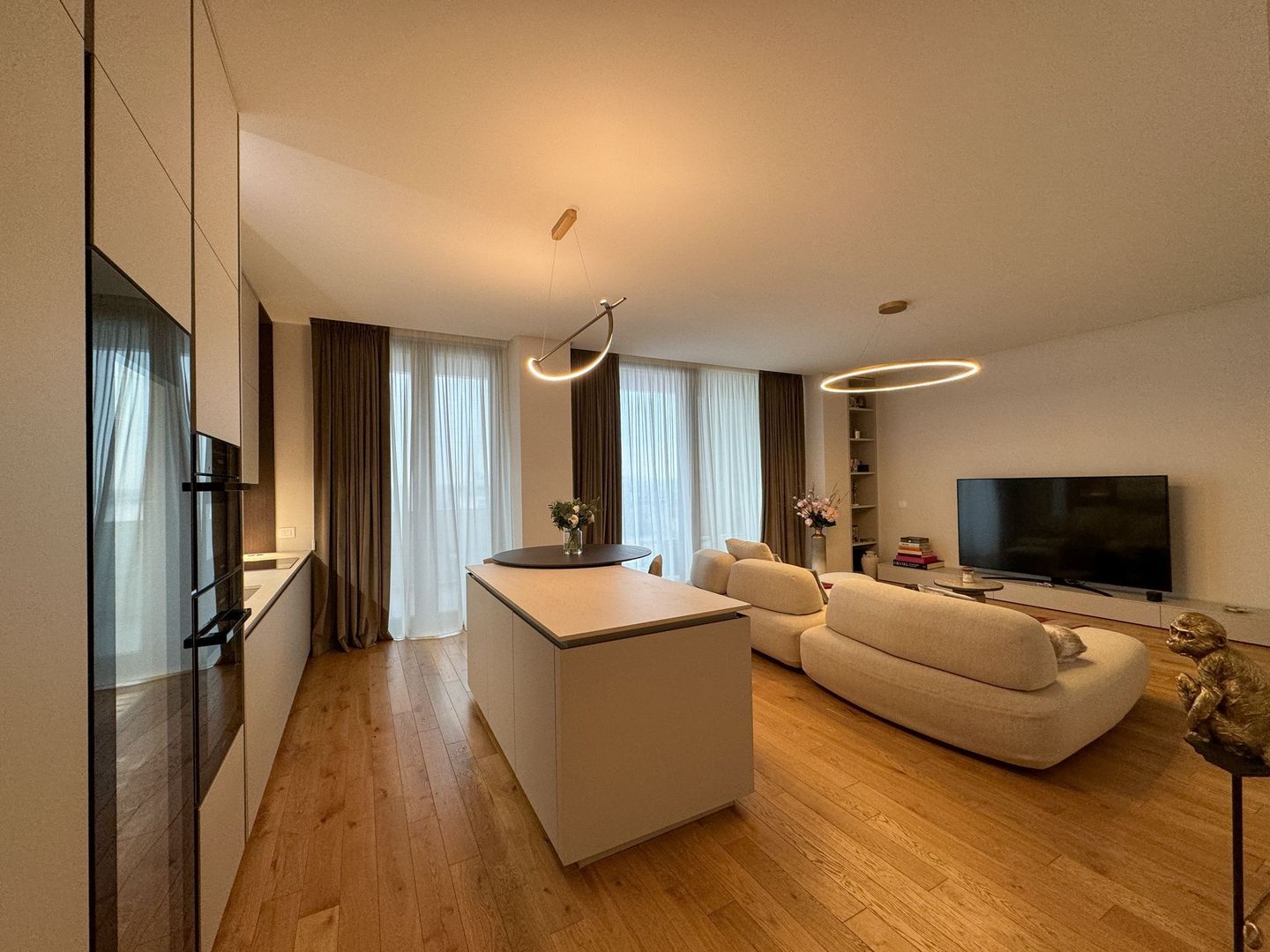 Livingul este un adevărat refugiu al relaxării, cu o atmosferă primitoare și o priveliște panoramică spectaculoasă asupra orașului. Bucătăria este un spațiu desprins din paginile revistelor de design interior, complet echipată cu cele mai moderne electrocasnice și accesorii premium.
